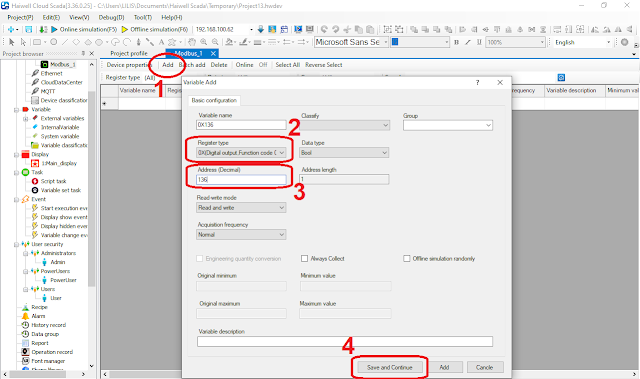 3. Pada pertanyaan "Do you want to define the variable of the device now?", pilih Yes. Maka akan muncul halaman Variabel Modbus_1. Klik tombol Add. Di kolom Register type, pilih Digital Output, Function code = 01 05. Di kolom Address, isi dengan angka 136 (karena alamat Coil B9 berada di 136). Kemudian klik tombol Save and Continue untuk mengulangi pembuatan variabel di alamat berikutnya.